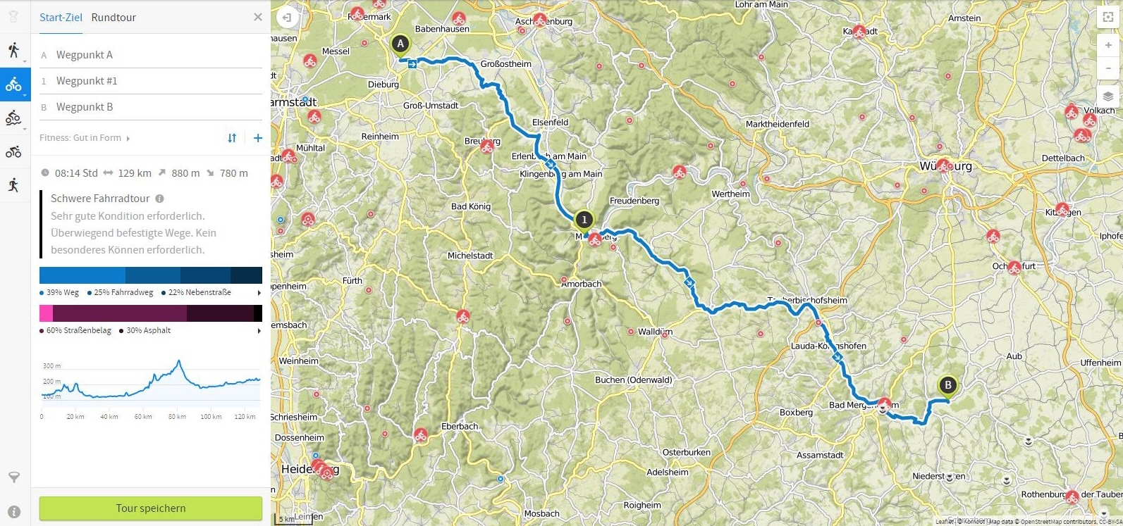 Wir fahren von Münster über Groß - Ostheim an den Main und folgen diesem bis Miltenberg. Über kleinen Höhenzug fahren wir nach Tauberbischhofsheim und im Taubertal bis nach Tauberrettersheim.